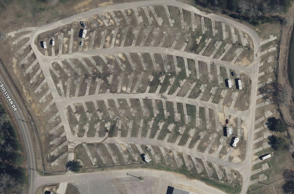 The Forrest County RV Park is adjacent to the county fairgrounds at The Center, and is a basic campground in a field. The only real amenities are a bathroom, which they closed without notice after the weekend event ended, and a small lake. The latter is hidden in the back, and we were there for 2 days before MW even noticed it. There are 147 paved, full-hookup sites, 50 with 30/50-amp and the rest with 30-amp only. On the plus side, it is very clean, close to Hattiesburg, has pretty long sites, and is inexpensive for full-hookup. There were several things on the down side, though. All sites are first-come, first-served, which was not an issue when we were there, but there wasn’t anything major going on at the fairgrounds. The sewer and water connections were at the rear of the site and there was no dump station; this required us to purchase a second stinky slinky to make the distance. Sites were level side-to-side, but all had dips and uphill sections front to back which appeared to be for drainage. All sites had concrete patio areas, but as noted on our arrival day, the parking pads are only 8′ wide, and some have pretty significant drop-offs if you miss. The surrounding grass is lovely, but when you walk on it, as you must to get to your vehicle, you sink into dampness. The only time the ground wasn’t squishy during our visit was when it actually froze. Finally, the entire camping section appeared to be in a low spot that may have even worse water issues in serious rain. Many folks used this as an overnight stop, and for that it wouldn’t be terrible. There are a couple of sites near the front that would be easy to back into. We probably wouldn’t stay for any more than that, though, if we had a choice. For this visit in January 2026, we paid $35 per night for 5 nights. Sorry to say, I didn’t get any pics. Here is a screenshot of the map, though.