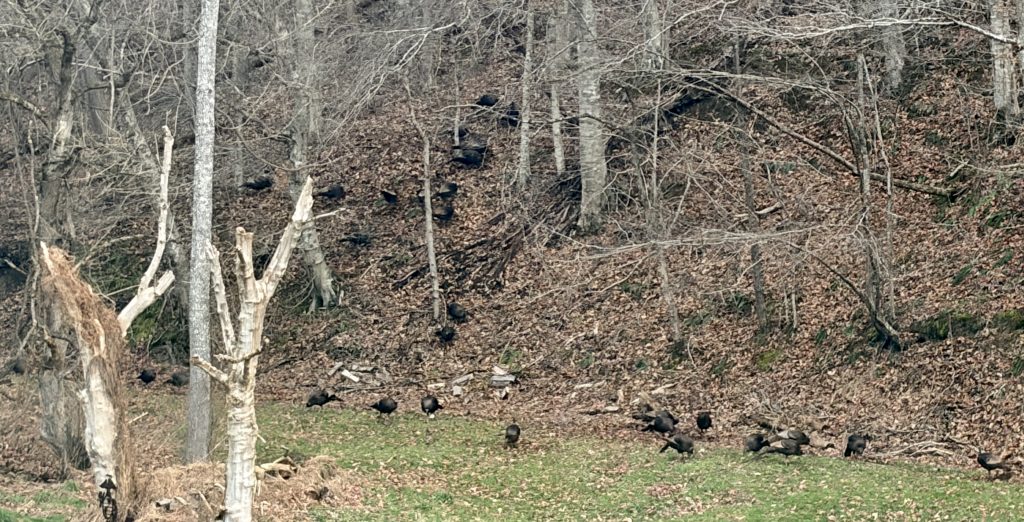 A week or so before hitting the road again, we started having some serious animal activity at the barn. For several nights, we had at least one and sometimes two large packs of coyotes making a ruckus several times each night. Sometimes they seemed just up the hill near the tree line! We had just been talking about the lack of coyote song this season, too. The Saturday before we left, MW caught sight of a huge flock of turkeys out Priscilla’s rear window. We counted 42!! They were wandering around in the grass and on the hillside scratching for bugs. We see turkeys occasionally, typically in groups of 7-12, but the only other large group was 35 several years ago. Maybe this is what the coyotes were looking for? Later that same evening I turned on the awning light and headed out to the barn to fold some clothes. One of the motion-sensor lights was on, and when I stepped out the door, two large deer were standing about 20′ away staring at me. I told them they were fine and I wouldn’t hurt them, then went into the barn. They were still watching me as I went through the door. About 10 minutes later, I opened the barn door expecting to see deer. Instead I was hit in the nostrils with a severe stink. Near where the deer had been there was now a fairly large skunk, or what one of my Boogers used to call a stunk. Peee…u!!!! He immediately headed in the opposite direction, but it took a while for the smell to clear. It looked like the same one we’ve seen in the field several times this season.