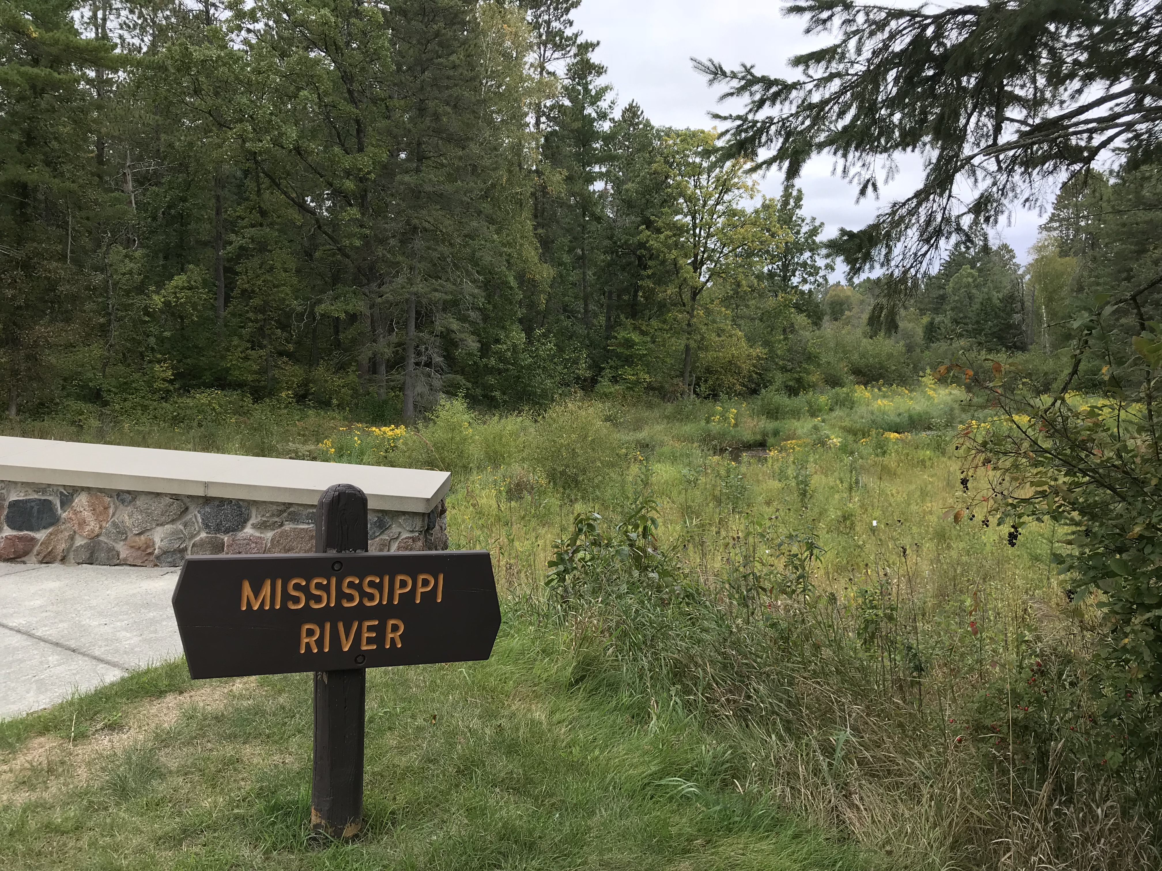 Standing over the water that starts the Mississippi River. Lake Itasca on the left, and the headwaters on the right.