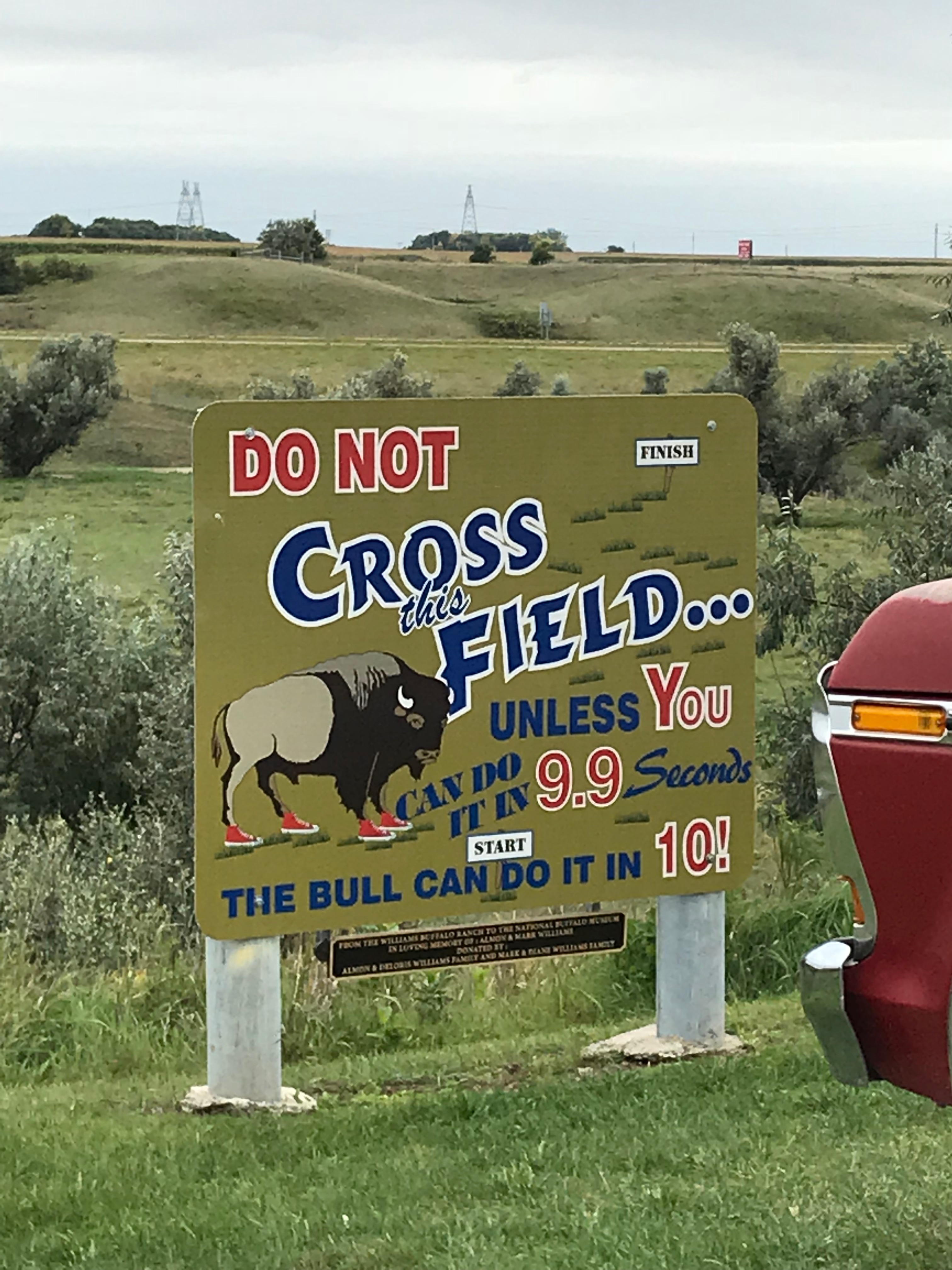 The country we are traveling through now is mostly rolling hills of fields and farmland, and there are hawks and other bird of prey everywhere. We also saw wild swans and turkeys. We stopped in Glenfield, North Dakota at a little park to have a picnic lunch, then headed to Jamestown, North Dakota to take a gander at the World’s Largest Buffalo. (We dropped Penelope off at Lakeside Marina and Campground on the way into town.) The National Buffalo Museum is dedicated to telling the story of the American Bison and protecting a herd. It is next door to a Frontier Village, which was really neat. Sadly, the herd was in the other end of the pasture, so we didn’t get to see their white buffalo.