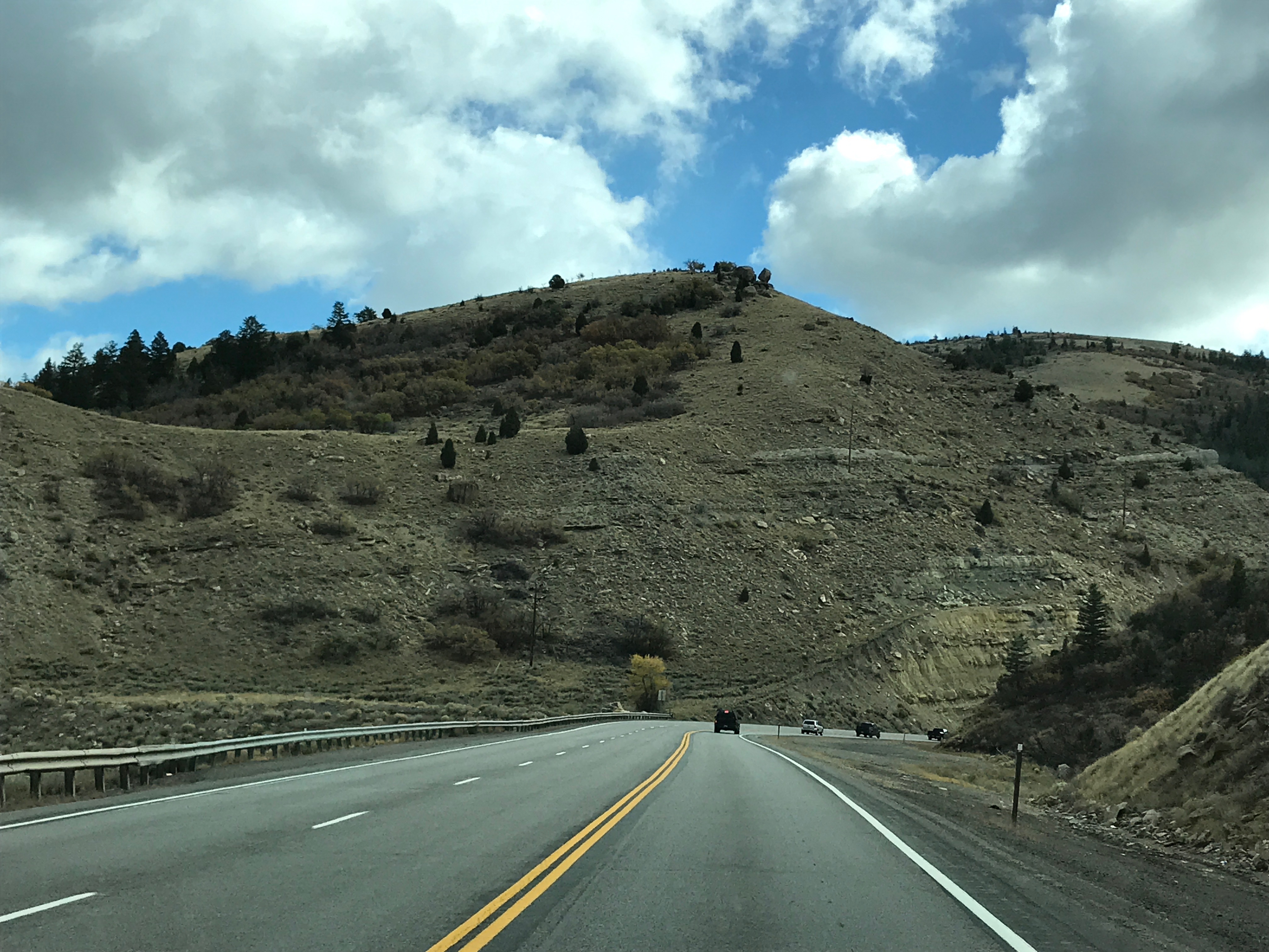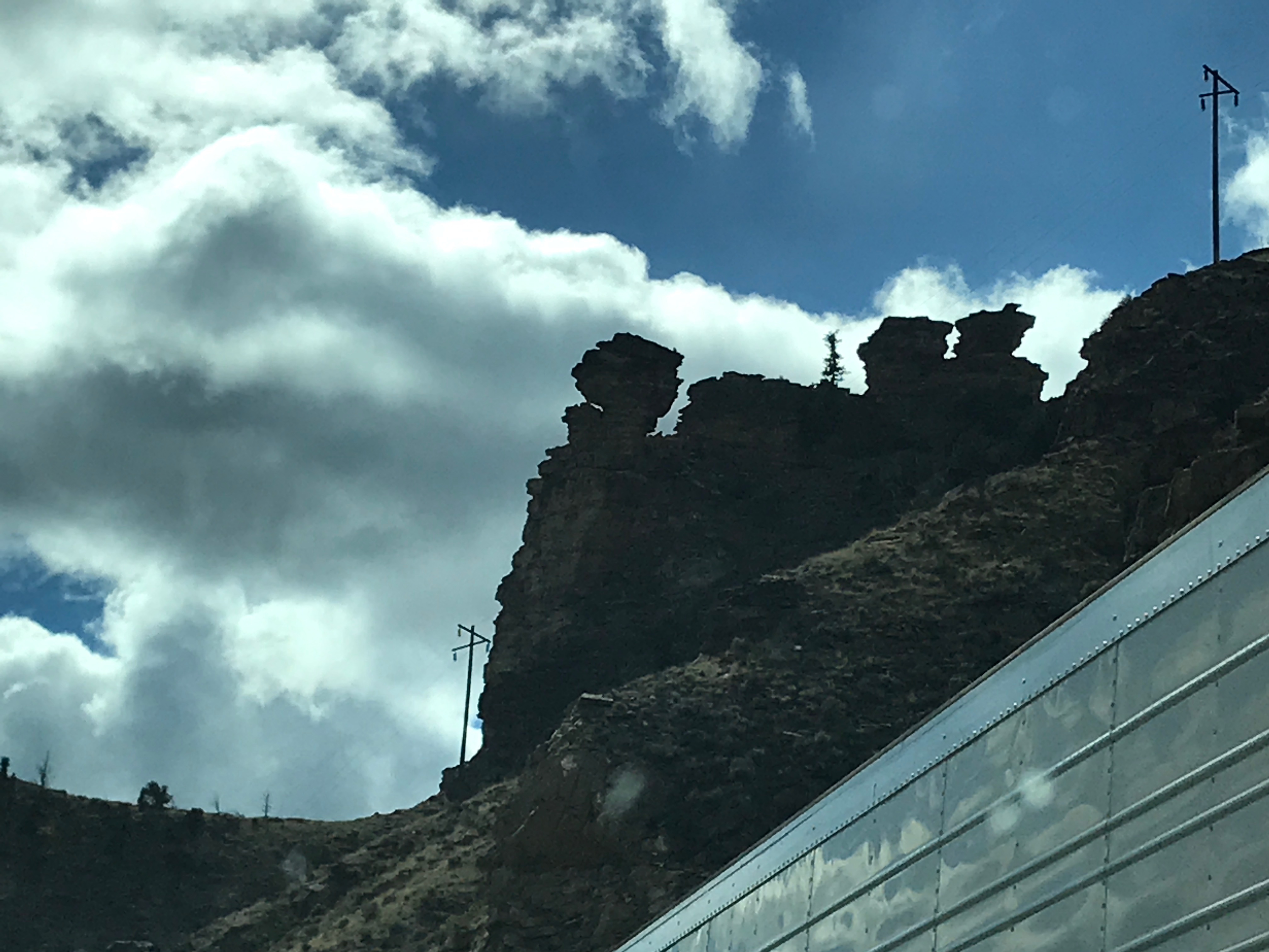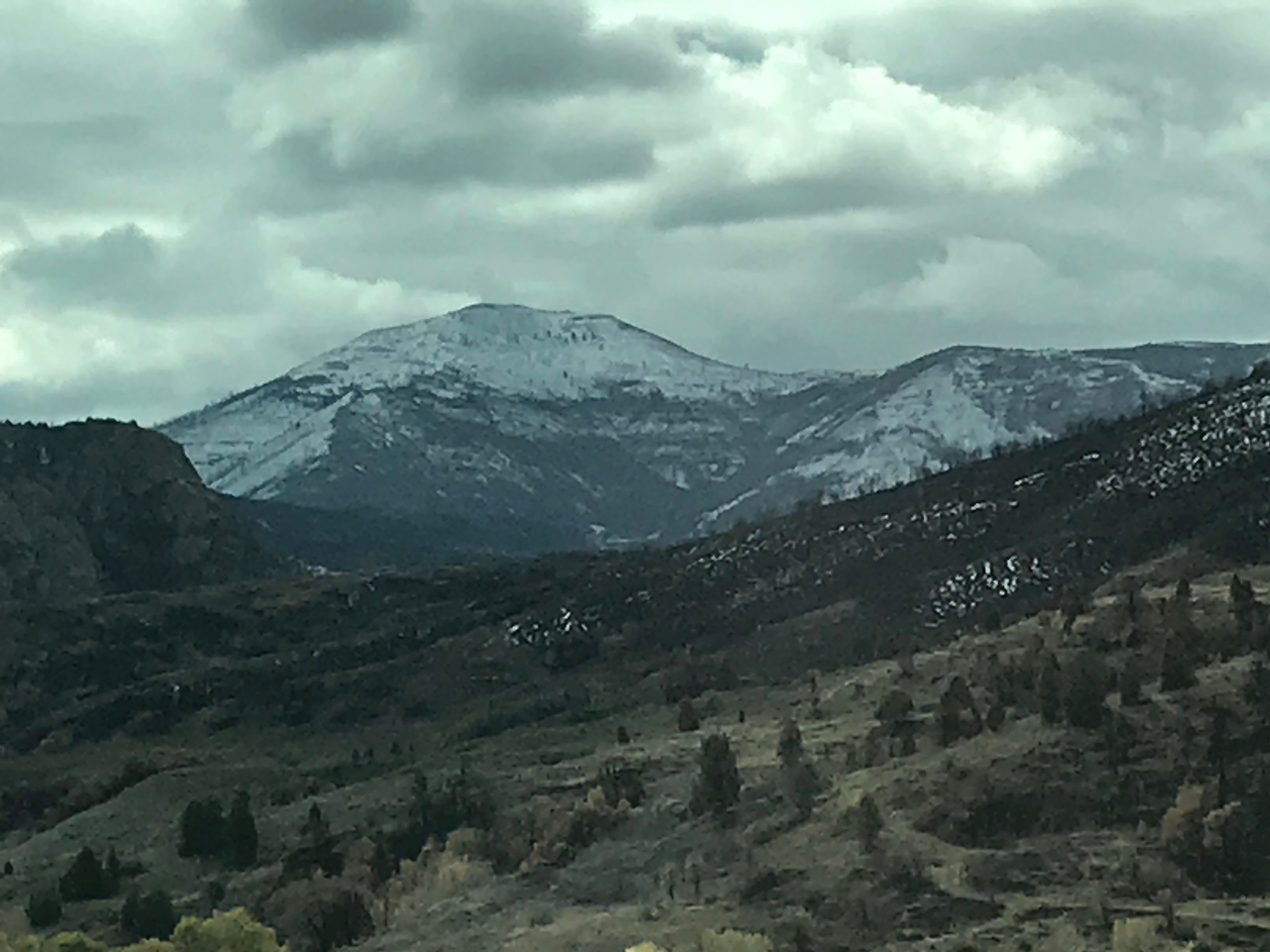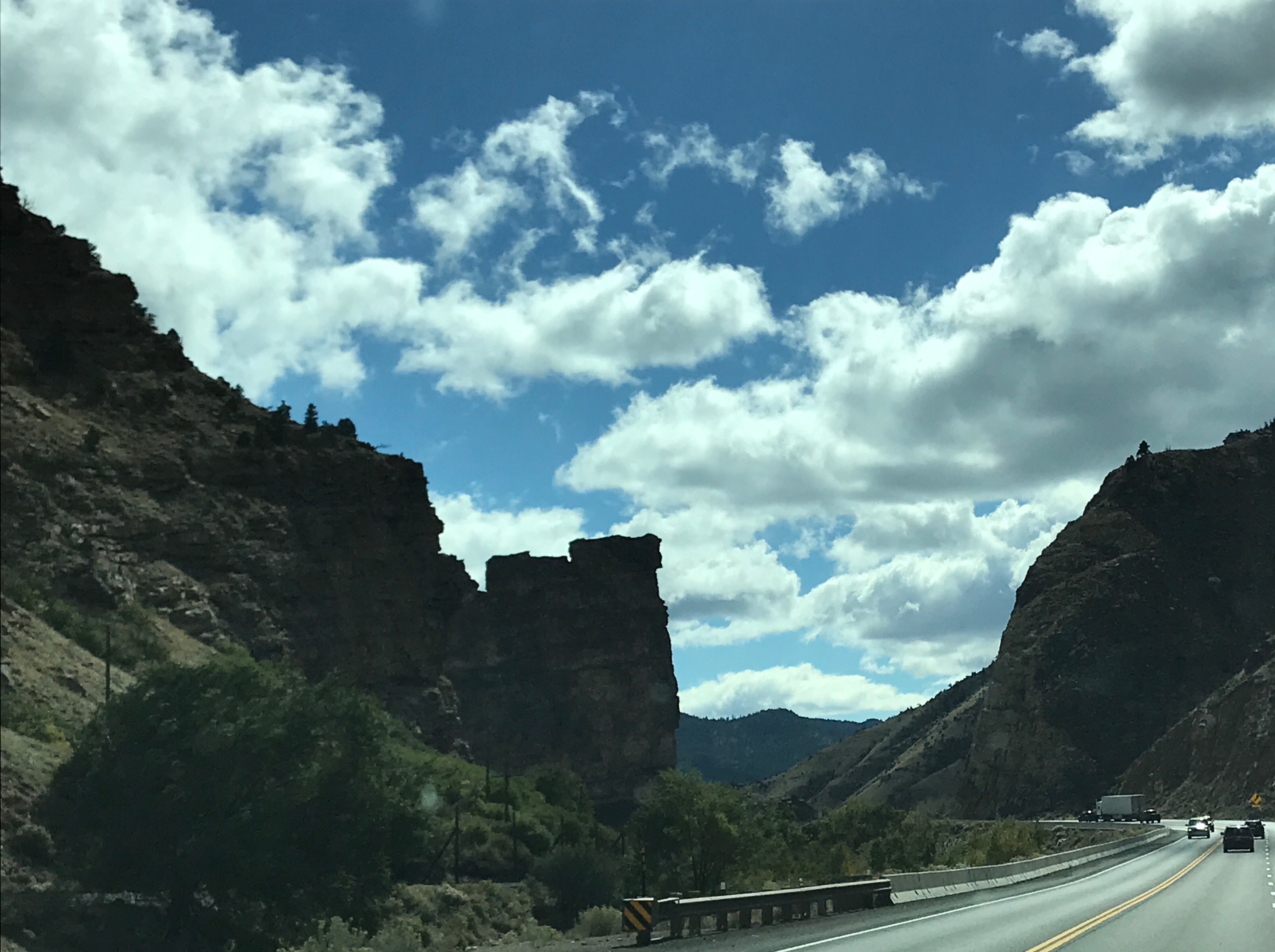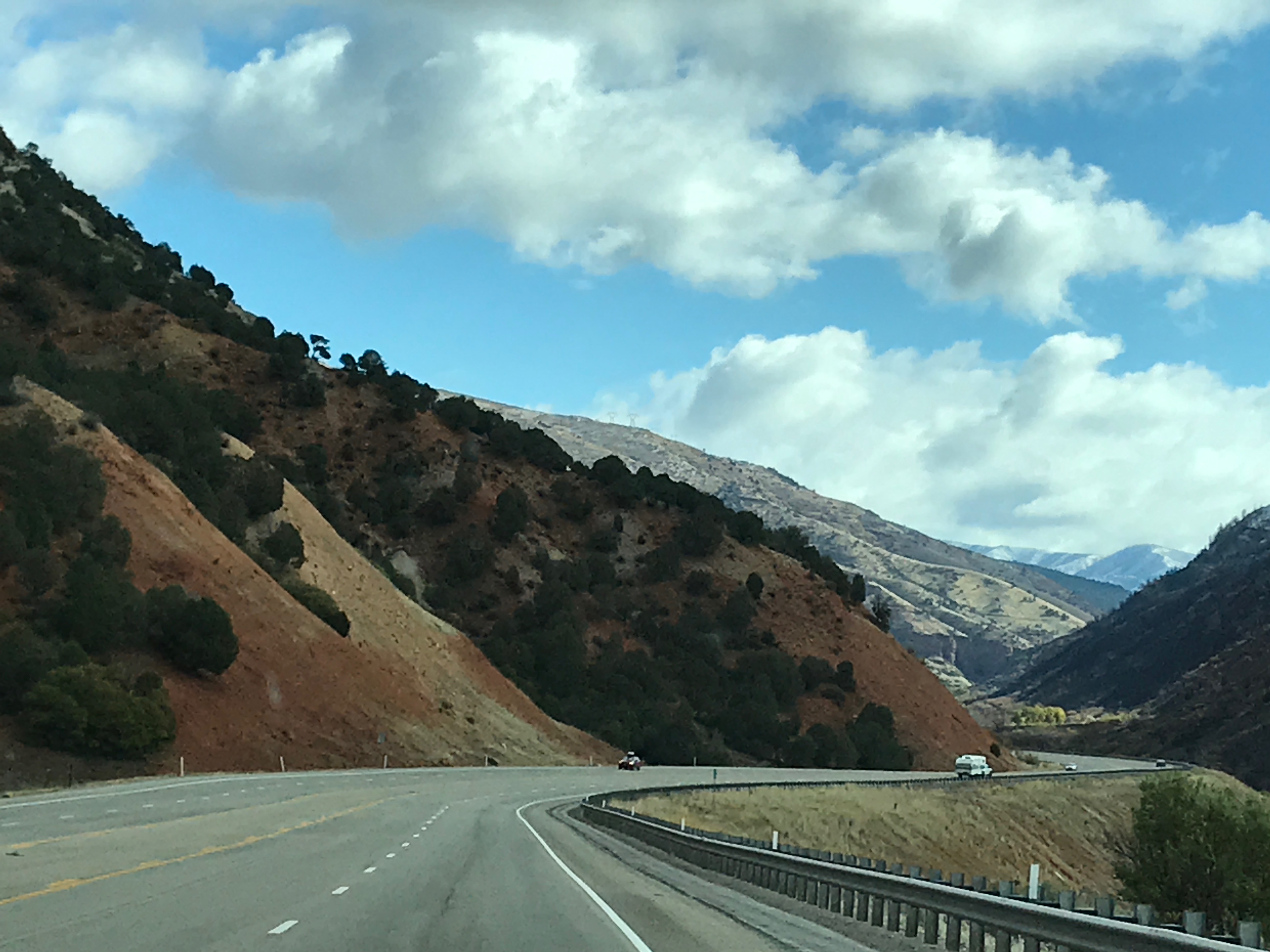 After breakfast, MW put the pedal to the metal, and we didn’t stop for a while. This part of Utah is all city. It starts well north of Ogden and goes down past Provo. (We turned off at Spanish Forks, and it was still all city.) The 15-20 mph wind makes us happy to be enjoying the protection of the truck. We took US-6 over the pass at Soldier Summit. The temps dropped a few times coming through the mountains, but not too bad. All week we had seen snow on the peaks above us, but now we were up in the snow. There was never anything more on the roads, though, than small piles at the edges as evidence that plows came through before. The land through the mountains alternates between hilly, scrub-covered fields with lots of low grass and rocks and steep, rocky abutments. One minute you are in rolling hills, then you round a bend to find cities of rock towers with small trees crammed in the cracks, or flats with dirt devils dancing about. There have been several times on this trip that I have been sleepy in the middle of the day, but I try so hard to keep my eyes open for fear of missing stuff!