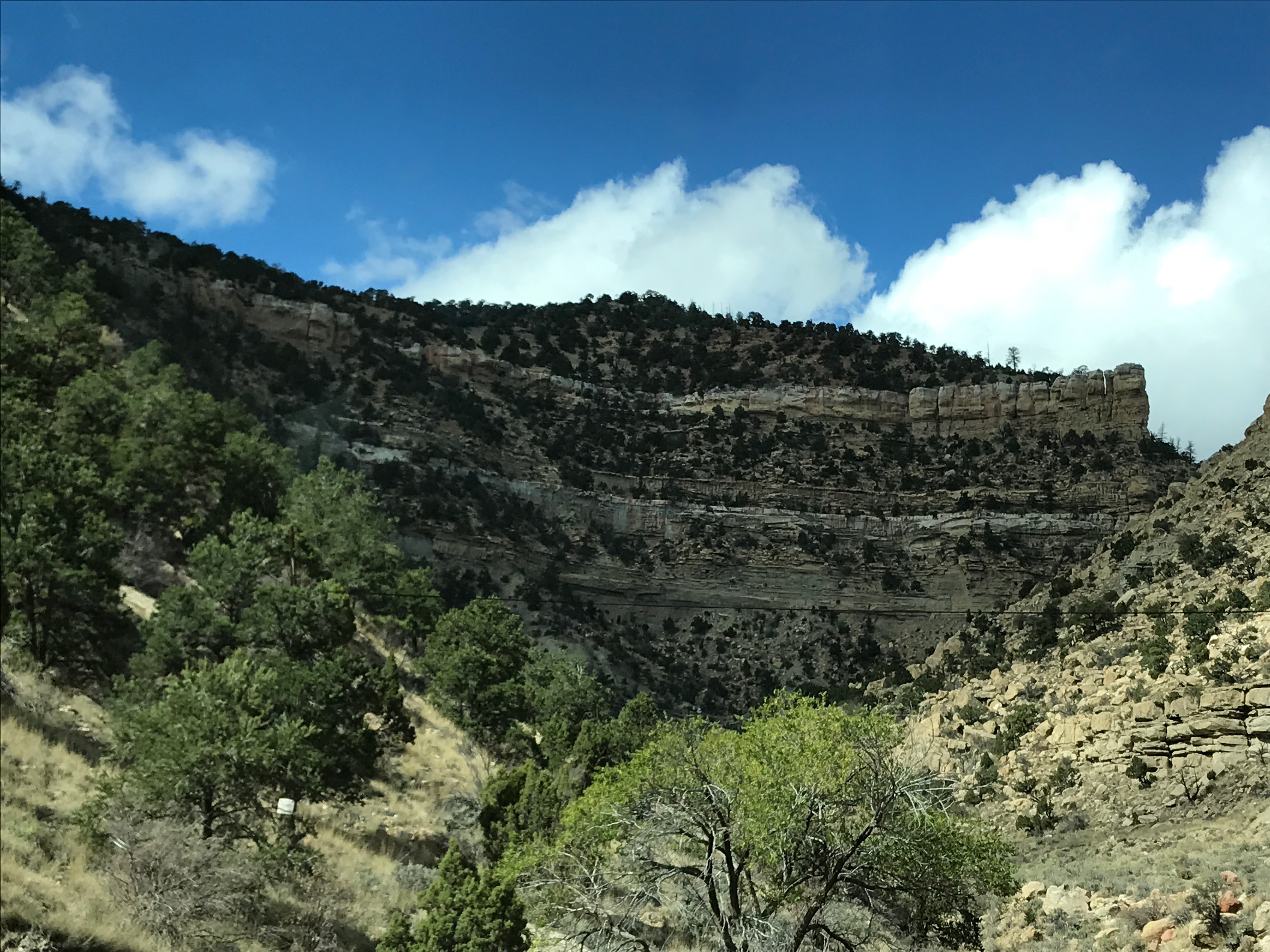 The cold weather and snow in the Colorado area are still pushing us south, which make us a little concerned about meeting our visiting window with friends in a few days. As a result, we were up and on the road before 7 AM this morning to get a good day in. The mountain time zone was about 1/4 mile down the road from the campsite, so we went ahead and set the clocks forward last night to be prepared, which was helpful in the sleep department. The good side of the detour, though, is that we are actually going to get down to Moab, Utah, which is where Jim and Cathy (cousins) are vacationing with their daughter Caroline and her family.