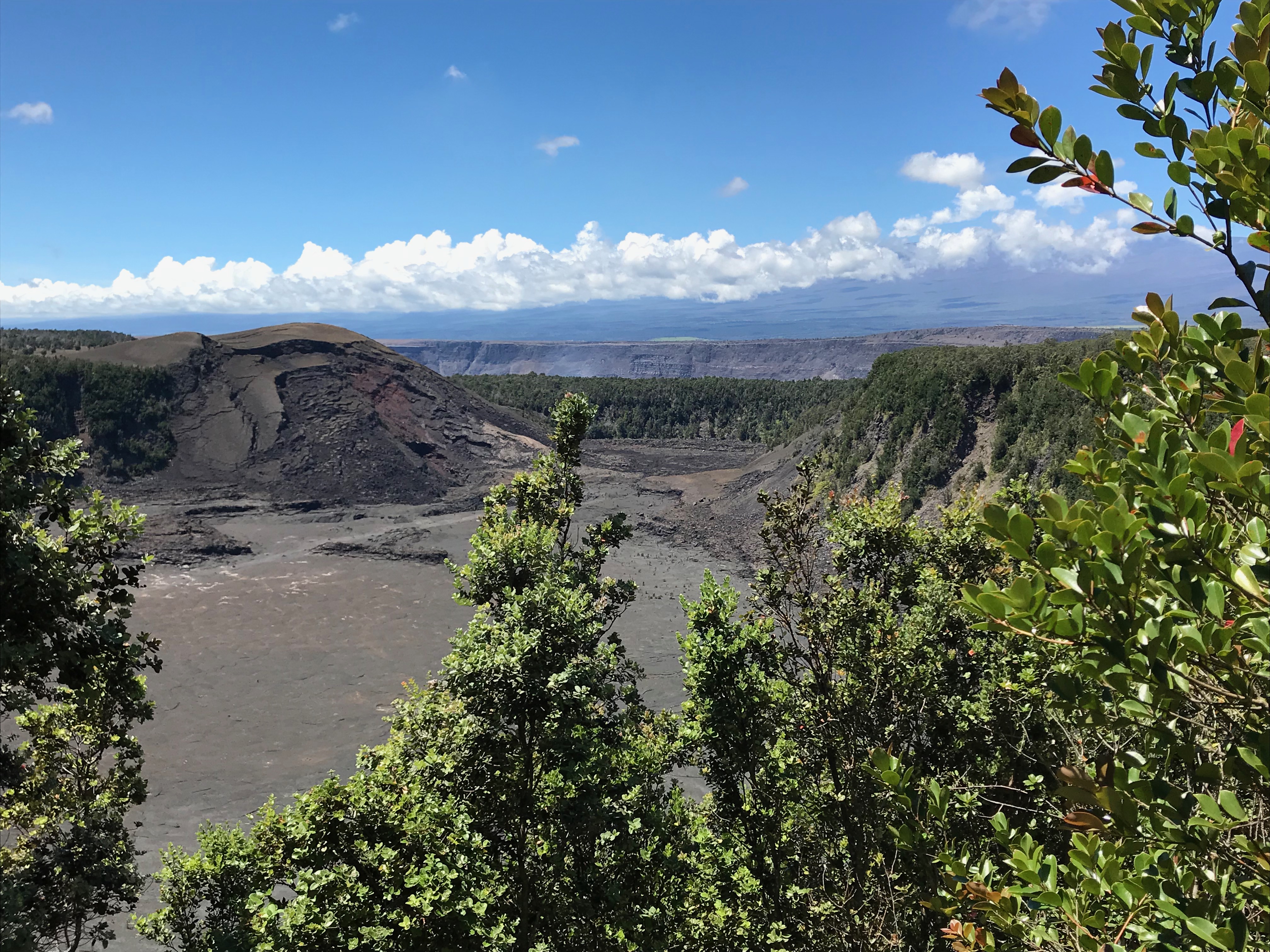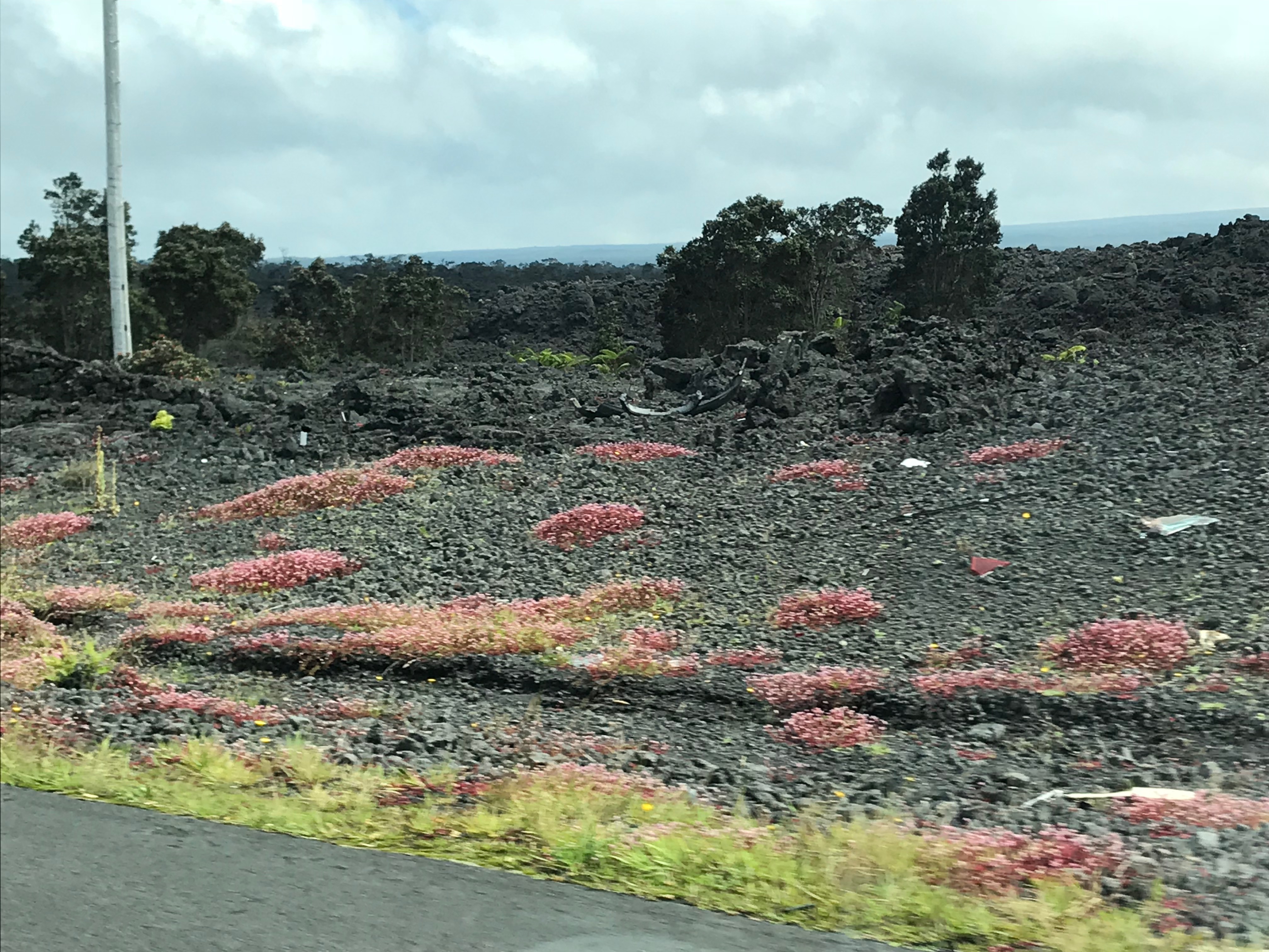 On the east side, we found a post office to mail cards to Booger Butt and Mom & Larry, then continued south on HI11 past Hilo and went to Hawaii Volcanoes National Park. (Sadly, we left our national park pass in the truck back in Washington, so we had to pay for entry.) Our first stop was the Visitor’s Center to get the lay of the land. After a little guidance from a park volunteer, we checked out the steam vents and the view of the crater from there. Seriously, there is no real way to describe this! It was amazing. There is steam coming up out of the ground in several areas, and the smell of sulphur is pretty strong in places. Despite the media coverage on the mainland, there are no active lava areas on the island now, and you cannot see anything glowing. In fact, the lava lake that was in the mouth of Kilauea for years and has shown up in all kinds of movies is now just a large black lava area, although they do say that it is still warm if you walk across it. From the pictures and info at the park, the most recent “eruption” didn’t really erupt. Seams opened up in various places and lava leaked out. The first seam to break open was in a neighborhood, but the lava was not flowing out fast as we mainlanders were led to believe by the news media. Next we headed to the other side of the large crater and drove down Chain of Craters Road looking at the various eruption sites for a ways. Since we were concerned about our time limit, we only went part of the way, then turned around. This is amazing scenery and sometimes very contradictory in the same area…lush plants and stark lava flows.