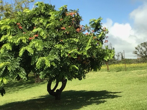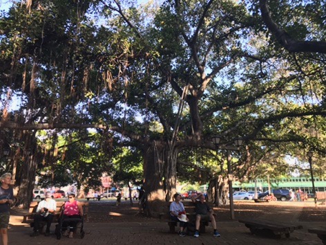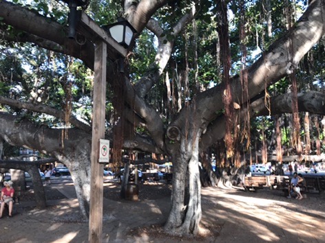 Back in Lahaina, we had a couple of hours to kill before the luau. We walked around a bit looking in the shops, but it was HOT, and I felt like I was going to combust. We found a shady spot under the giant banyan tree to wait it out. This tree fills the square, and although it looks like a bunch of trees together, it is one tree that has dropped multiple vines down to root. The heat was better in the shade, but 95 degrees and very high humidity still made us miserable. (If it didn’t mean riding the tender over and back, we would have gone back to the ship to rest and get a shower.)