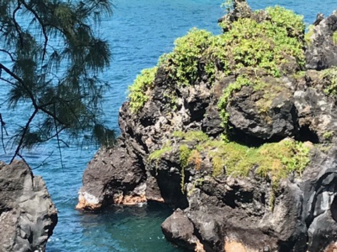 At lunch time we went to Wai’anapanapa State Park, where MW and I found a bench overlooking a beautiful bay to enjoy our sandwich. We walked around the park for a bit after eating, and I went down the long stairs to put my feet in the water on the black sand beach. The rocks were hot, and I quickly put my shoes back on! At the beach there was a lava tube, too.