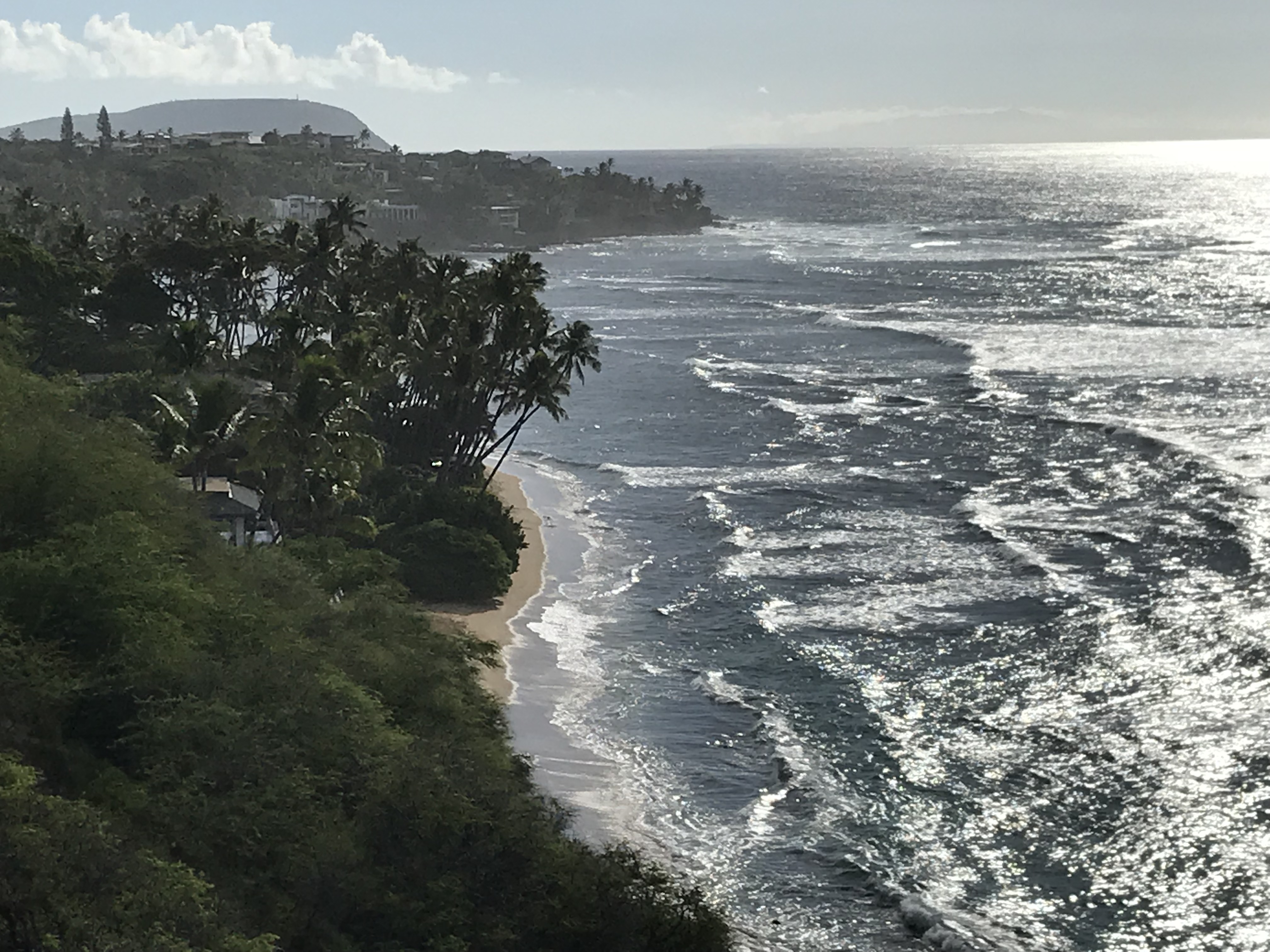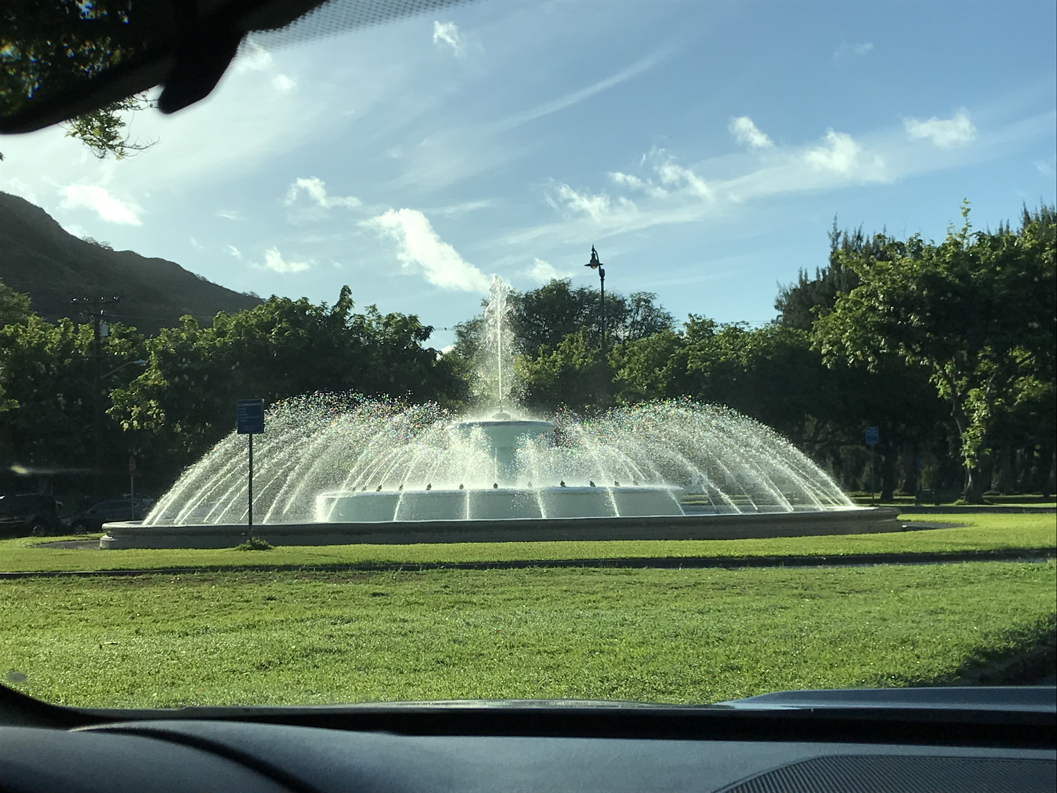 Today we got up, packed up, and headed out to try to beat the crowds at Diamond Head. Thankfully, we made it before the parking lot was full. (We tried to come to the park on our first day on O’ahu, but the lot was full and they told us to pull into the “waiting area”, which looked like it could take a while. Apparently, Diamond Head needs a reservation system like a nice restaurant.) We checked out the information about the park, which was pretty cool. What I found most interesting, aside from the general island creation and volcano stuff, was that, when used for defense, the guns were actually placed on the side of the crater away from the ocean and fired using lookouts at the Fire Control Station at the summit. That way the ships they were firing at could not see to take out the guns. Genius! We walked up the path that leads to the crater for a ways, then headed back down. This entire area is full of trees and grasslands. It is typically very hot and dry, receiving only about 25 inches of rain a year. We can attest to the HOT part! By the time we got back to the car, we were soaked! However, it is a beautiful place, and worth the visit. (I would love to have climbed to the top, but new knee was not feeling it.)