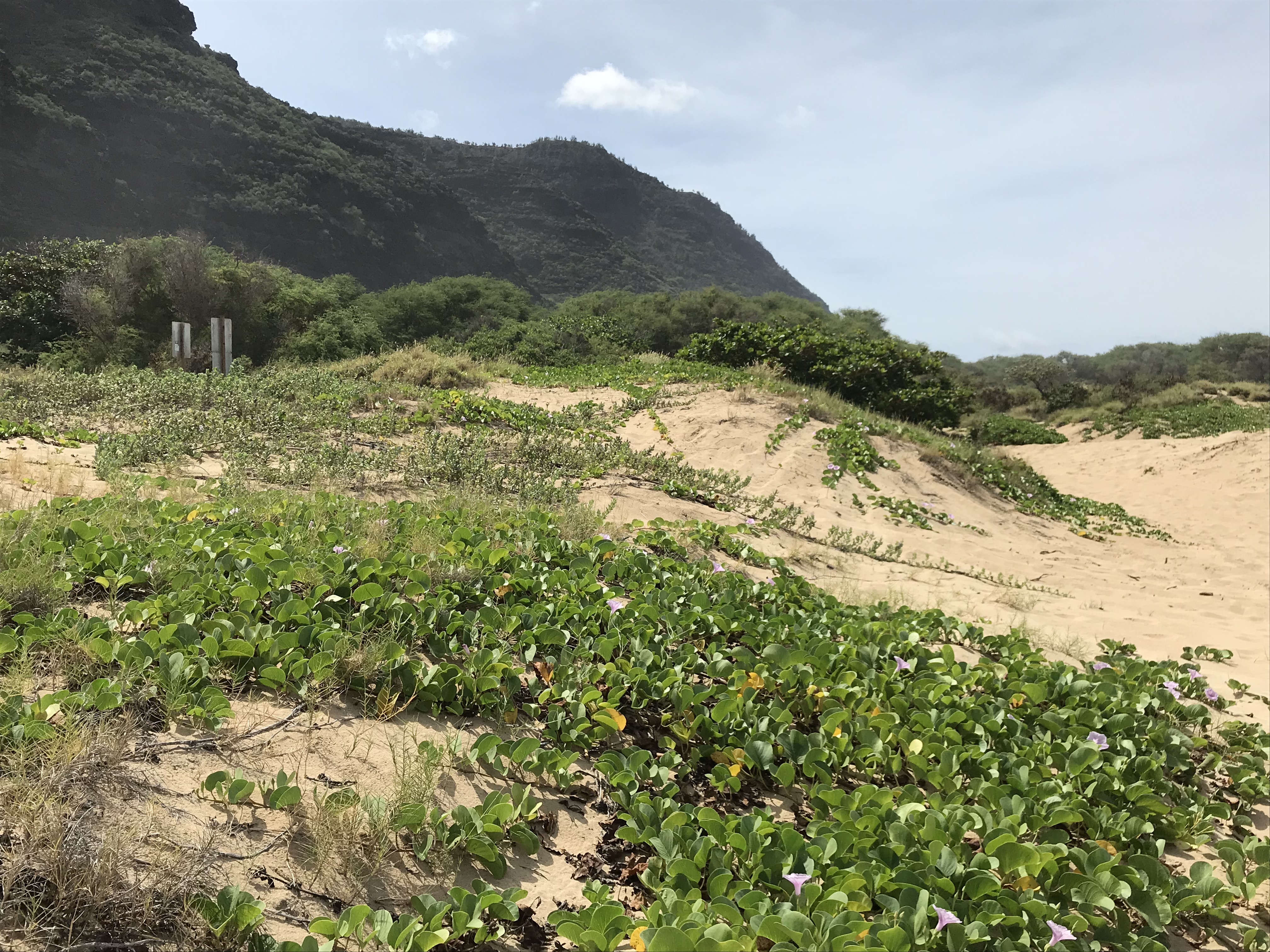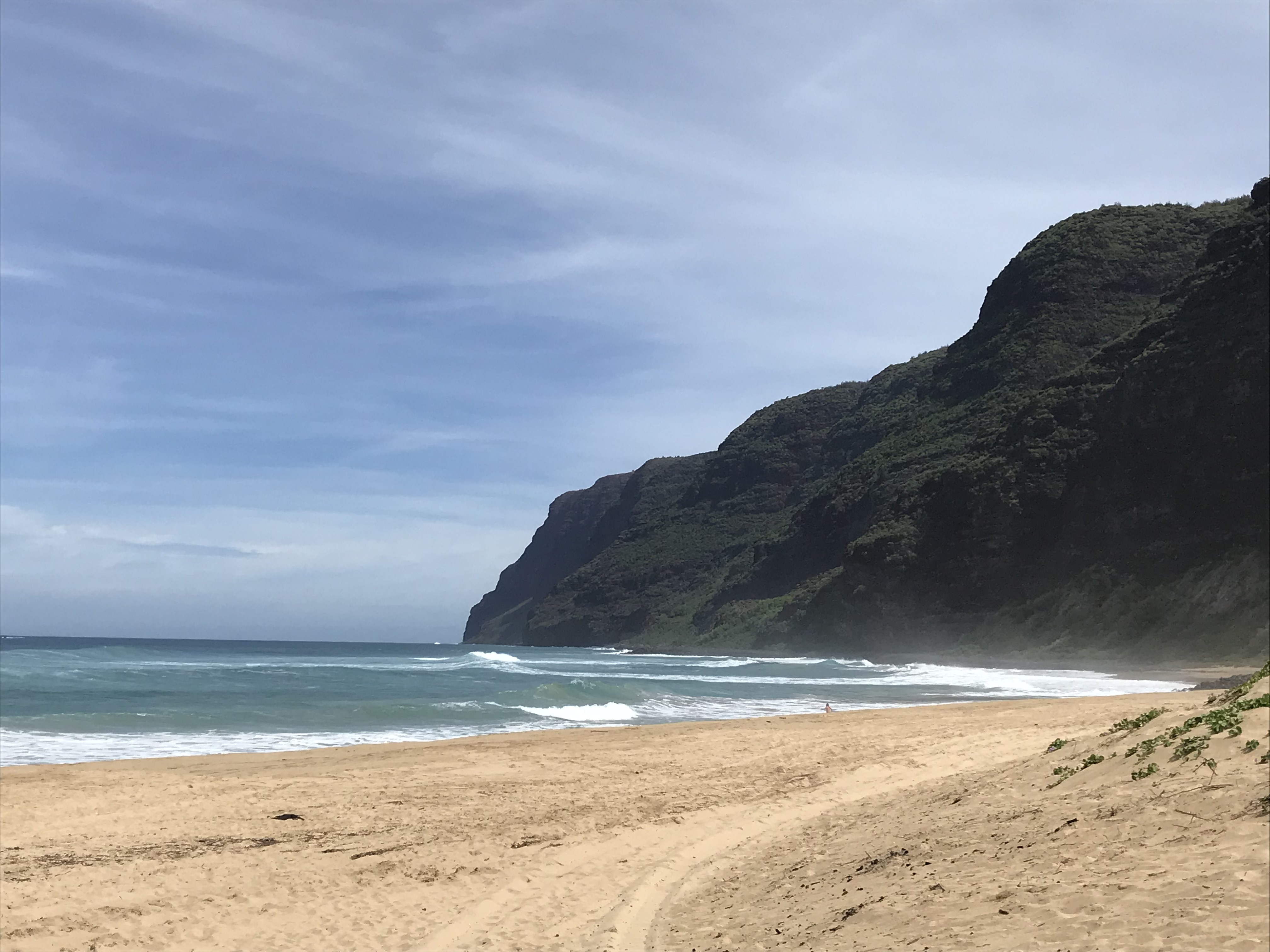After looking around for a bit, we drove back down and into Kekaha, then headed out the Kaumualii Highway towards Polihale State Park. Along the way we pass Barking Sands Pacific Missile Range Airport, then a little further down the road, it suddenly becomes gravel. It is a wide, well-traveled road, so we kept going. (It was very rough in places, though.) About 4 miles further, it gets much more narrow and turns to sand. We figure we are almost there, so what the heck, we keep going. It was a little crazy, but totally worth it! The waves here were CRAZY, and it was clearly not a swimmer’s beach. There were only a handful of people around. The beach had dunes, then dry sand, then it dropped off down a steep hill to the wet sand. (The heavy surf is carving it out.) I went down to the edge to put my feet in the water, and when I reached the edge, a guy walked quickly out into the water to about thigh depth. He was promptly knocked on his butt and struggled mightily to get back up and to the beach. When he was back upright, a woman walked up and said she was thinking about going in. He advised against it, and she listened! Here is my two cents: If the waves are crashing and the beach is eroded into a little cliff, there is a good chance the undertow is outrageous. Make a note. After cooling my toes for a few minutes and walking around a little more, we headed back. Here is a little video, but you can’t see the drop-off on the beach: