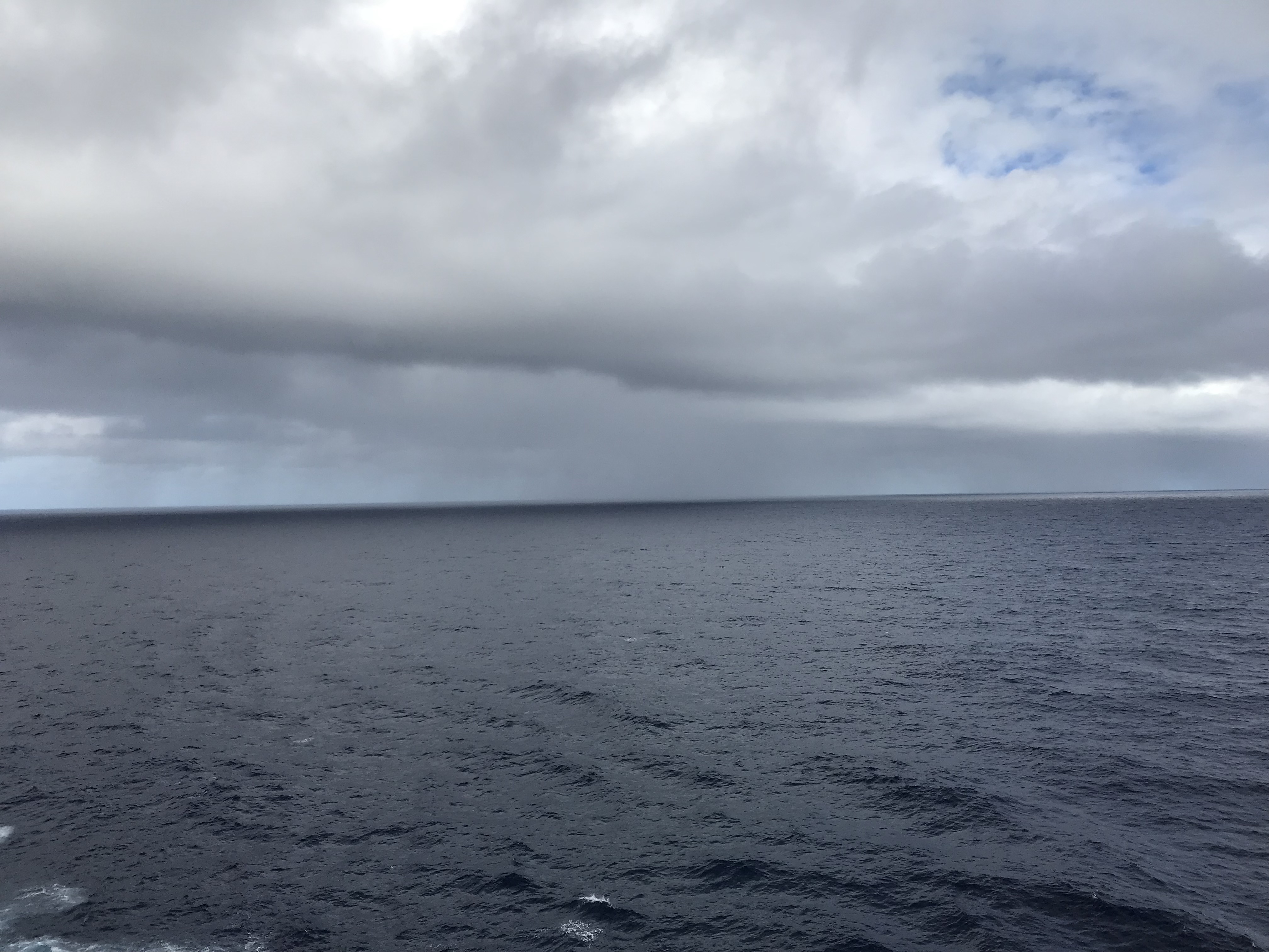 motorhome (one in Australia and one in New Zealand) so we had lots to talk about. I definitely would like to RV in Australia someday. Next we headed to the Sky Bar, where I worked for a little bit while we waited for today’s trivia. First it was music, then general information. We found out that we pretty much suck at both. LOL It was fun, though. While we were looking out the window there, MW saw a white bird. Finally, signs of land!! Then he saw what he thought was a flock of birds close to the water far below, but it turned out to be flying fish. I had no idea that they flew so far! Too cool. The ocean has consistently been deep blue since we left the mainland, but we saw very large, long trails of something green. Algae? Fish? Trash? We couldn’t figure it out. Once trivia was over, we went back to our cabin to get ready for the formal dinner. Why can’t anyone make formal clothes that aren’t hot??? I really like to dress up, but inevitably feel like I’m melting. Both still a little under the weather, we went back to the cabin to relax right after dinner and turned in early.